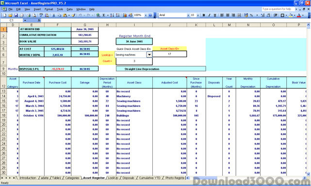 Asset Register PRO for Excel supplies nine asset registers plus YTD depreciation reports for fixed, intangible and investment assets, updating and reporting depreciation calculations and book values at each month end. Each asset entered into the register can contain the asset sequence number, date of purchase, description of asset, serial number, supplier's name, purchase order number, G/L reference code, accounting cost, useful life (depreciation period), physical location, plus if/when disposed/sold and gain/loss calculations and impairment ledgers for investments, intangibles and goodwill. Asset Register PRO can be used by the smallest to the largest enterprise to keep track of their assets and monthly depreciation calculations. Asset Register PRO applies the straight-line depreciation method, and the declining balance method adjusted annually and monthly. Depreciation tables supply monthly depreciation and cumulative depreciation from the acquired date to any period up to 240 months. Quick and easy entry of assets into the registers using Excel's Data (Entry) > Form with the Name box. Asset Register PRO provides continuous month end sequencing so that the asset class registers update each asset depreciation and book value every month automatically and combines all month end values into a Year To Date and Totals report. Different depreciation periods can be applied to individual assets and within each class of assets. Asset Register PRO calculates book values at disposal dates and gain/losses on disposal. All month end depreciation calculations and book balances can be recalculated backwards and forwards to any month end date by making a simple one step adjustment to the month end date held in the adate field. You can recalculate and forecast depreciation totals and written down balances for any month end past or future. Such calculations can be very useful for preparing financial business forecasts and for checking depreciation calculations.